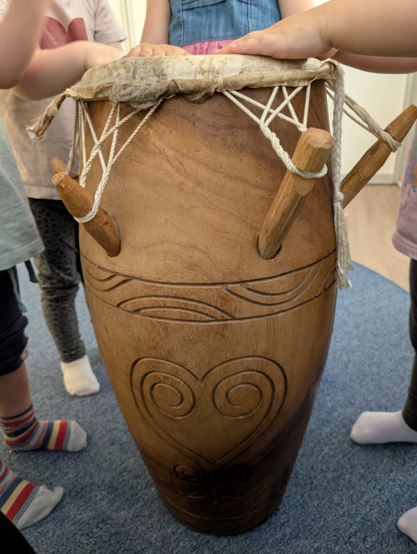 Instrumentenerfahrung: Trommeln, Rasseln, Klanghölzer, Glockenspiele, Klavier, Ukulele und vieles mehr. Die Kinder lernen eine große Vielfalt an Instrumenten kennen und dürfen nach Herzenslust ausprobieren.